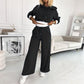 SZÉLES SZÁRÚ, MAGAS SZÁRÚ NADRÁG: Ez a melegítőnadrág hízelgő magas kialakítású, elegáns vonalakkal rendelkezik, amelyek meghosszabbítják a lábadat és kiemelik a derekadat, laza, mégis divatos megjelenést biztosítva.