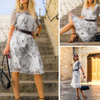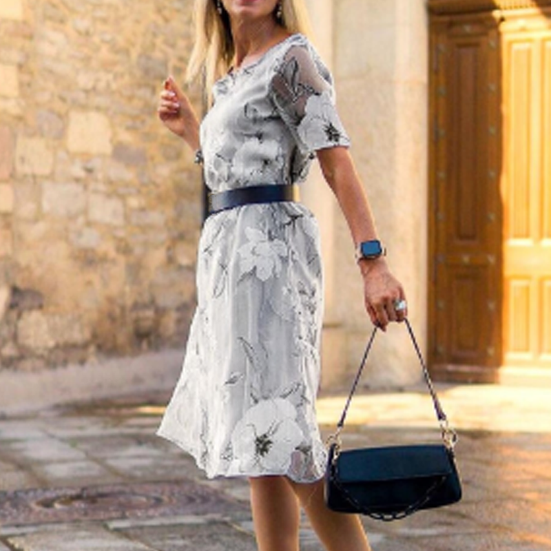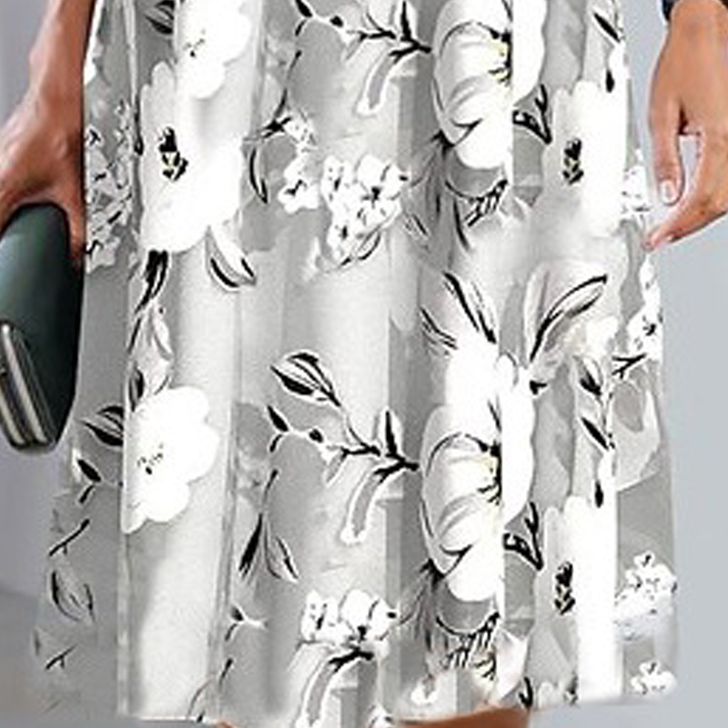 1 * Női laza, rövid ujjú ruha virágmintával és kerek nyakkivágással.