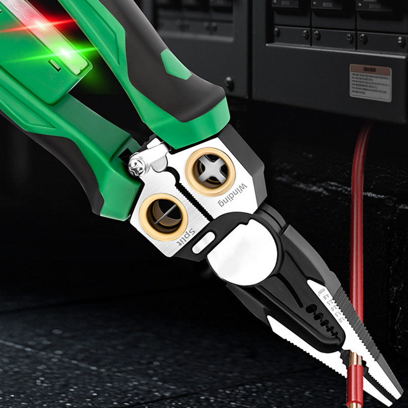 6 az 1-ben funkcionalitás: Egy kompakt szerszámban egyesíti a huzalvágást, a szigetelés eltávolítását, a tekercselést, az elválasztást, a megfogást és a feszültségtesztelést (12–220 V). A precíziósan köszörült, magas széntartalmú acél penge tiszta vágást biztosít réz- és alumíniumhuzaloknál, míg a beépített huzalelválasztó gyorsan és sérülés nélkül választja szét a párosított kábeleket. Nincs szükség több szerszám hordozására.