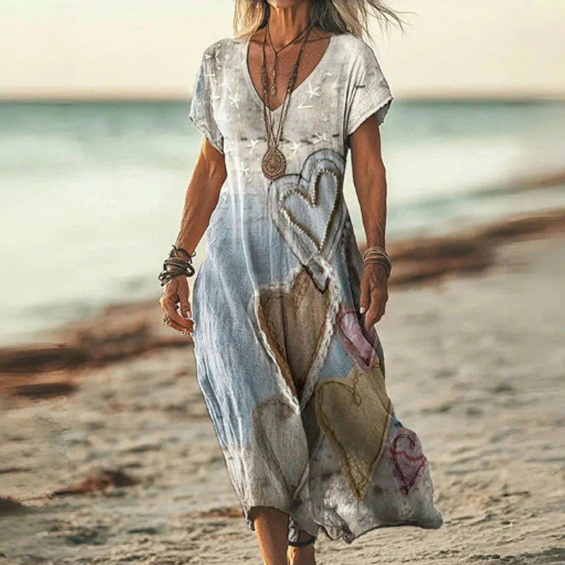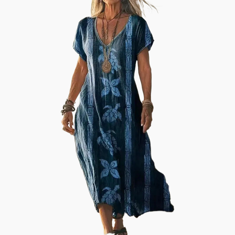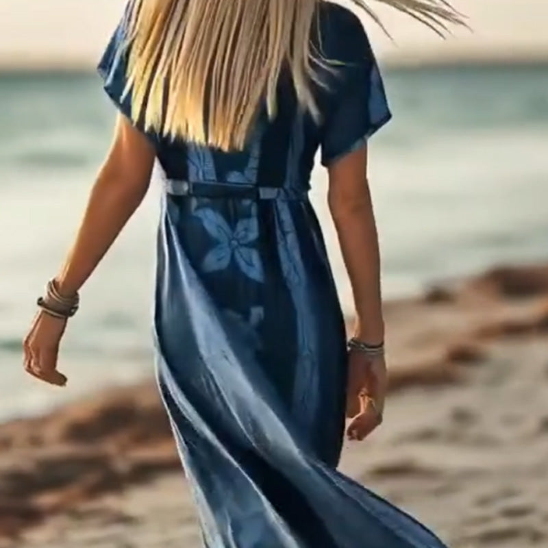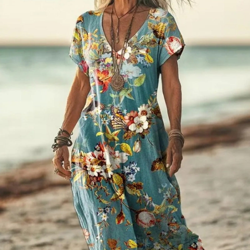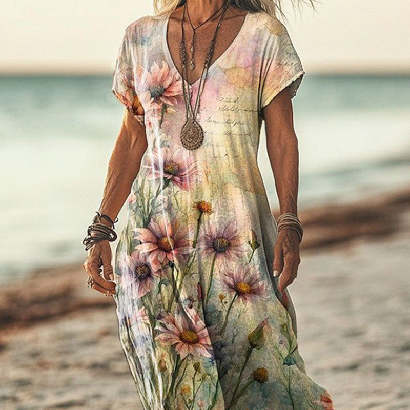 1 * Női elegáns virágos nyomtatás V-nyakú rövid ujjú ruha
