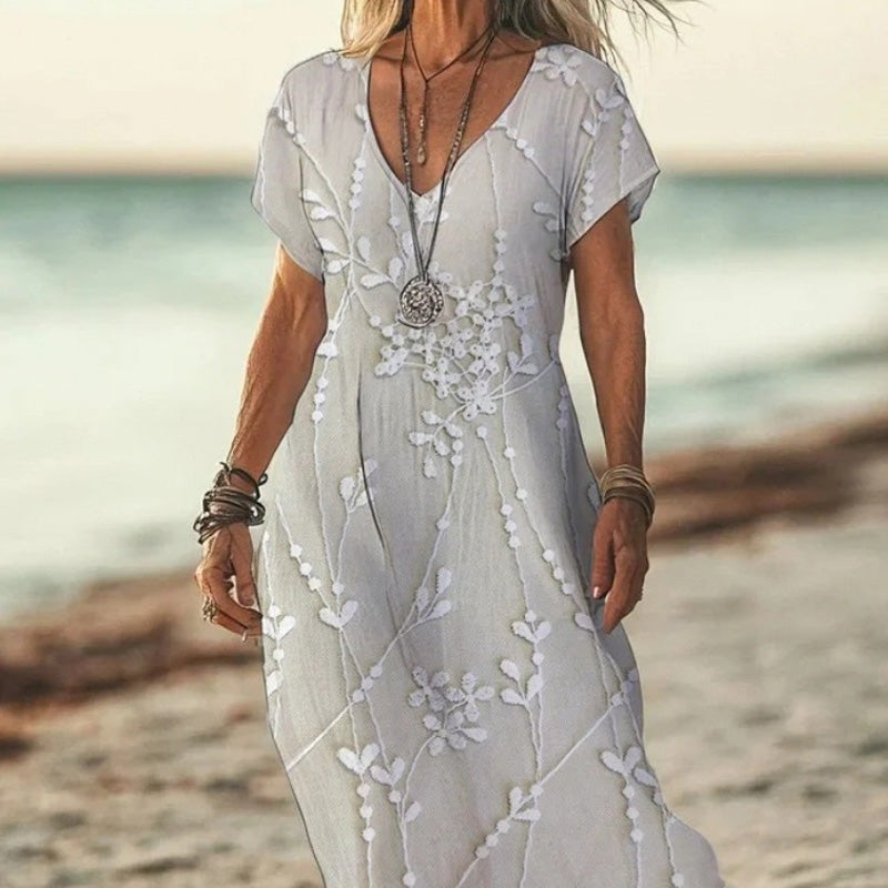 PLAIN V-nyakú és rövid ujjú KIVONAT - A finom V-nyakú vonal meghosszabbítja a nyakkivágást az elegáns sziluett érdekében, míg a rövid ujjak kényelmes fedést biztosítanak. A gondosan megtervezett hónaljrészek megakadályozzák a varratokat és teljes mozgást tesznek lehetővé, így ez a ruha tökéletes alkalmi kirándulásokhoz és különleges alkalmakhoz.