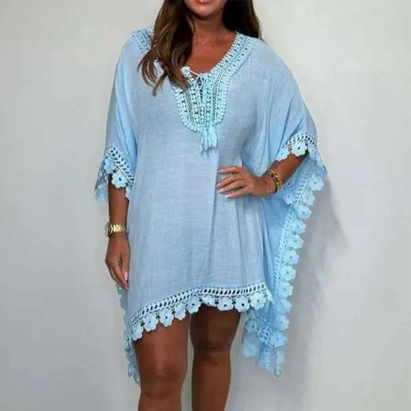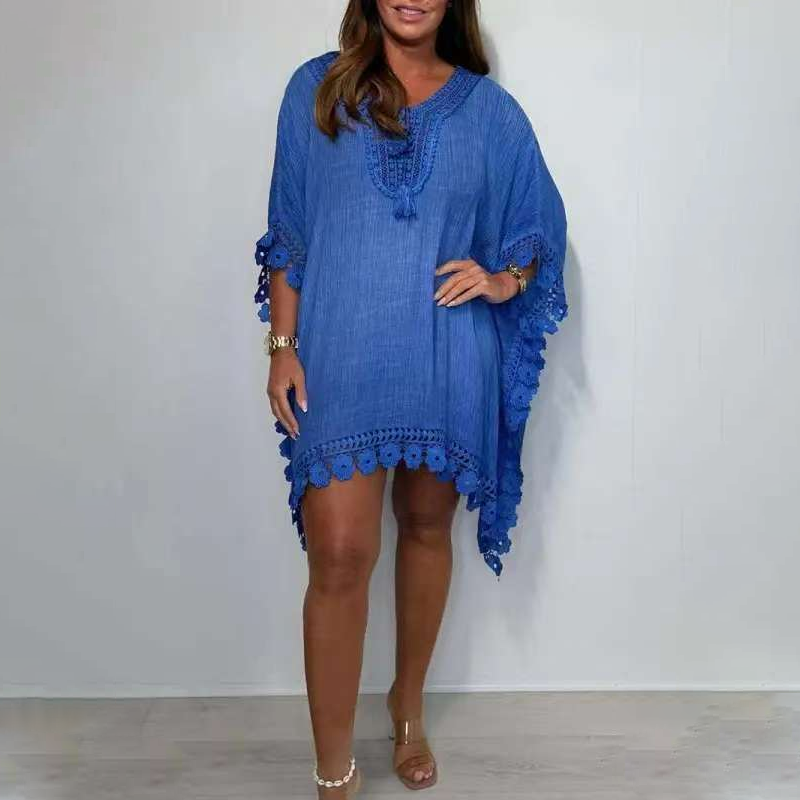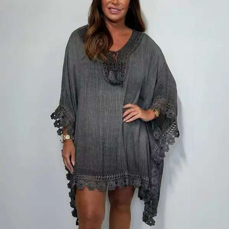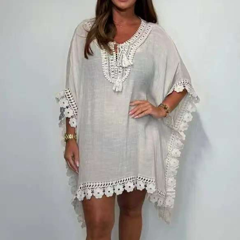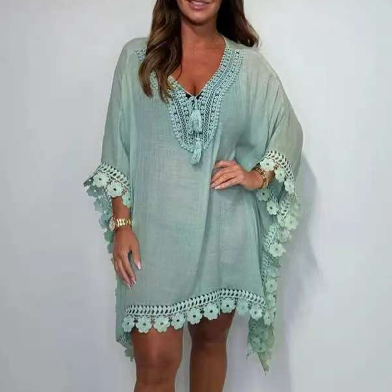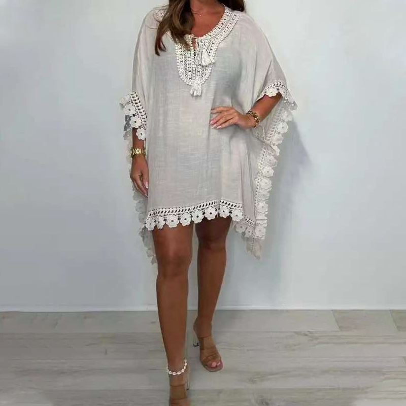 DIVATÚ TERVEZÉS: Emelje fel ruhatárát ezzel a divatos miniruhával. Az egyedi V-nyakú és lefutó ujjak hízelgő sziluettet alkotnak, a finom virágos horgolt díszítés pedig nőies bájt kölcsönöz. Tökéletes azok számára, akik könnyed stílussal szeretnének kitűnni.