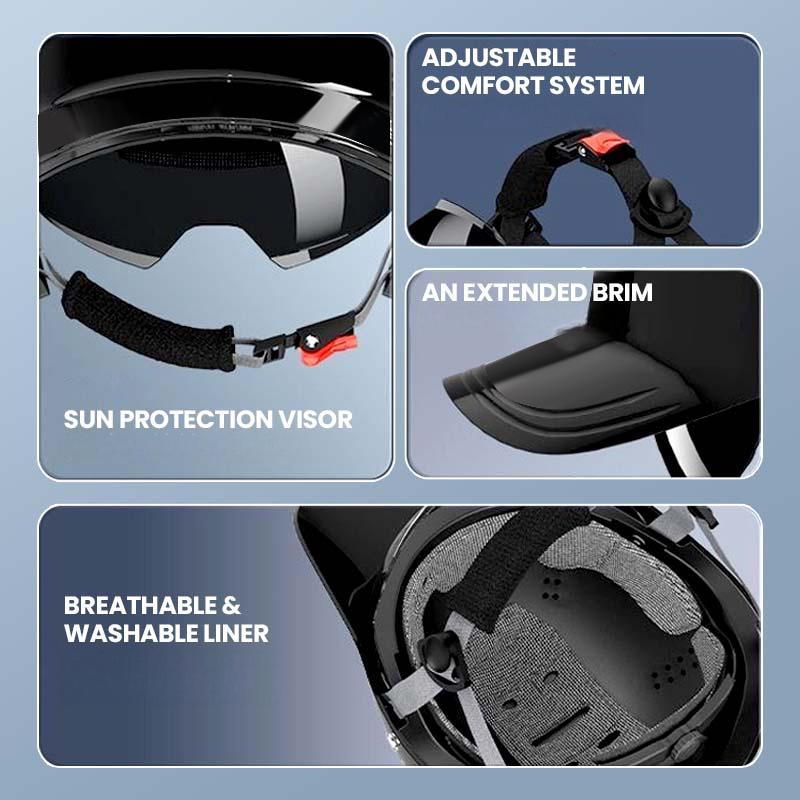 NAPVÉDŐ VISOR: A meghosszabbított karimája és a beépített, behúzható napvédő visor megvédi a szemét a vakító fénytől és az UV sugárzástól. Ez a kettős kialakítás javítja a láthatóságot és a kényelmet erős napfényben, anélkül, hogy külön napszemüvegre lenne szükség.